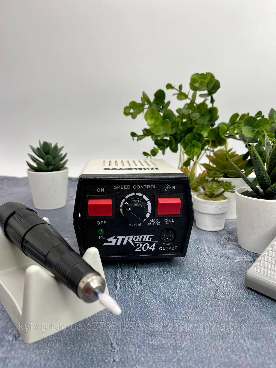 STRONG 204 - широко відома, перевірена модель. Володіючи швидкістю обертання до 35000 об/хв, фрезер чудово підійде для професійного або домашнього використання. Прилад має наступні переваги: 1. Висока потужність апарату дозволяє використовувати його для манікюру і педикюру. 2. Оригінальна ручка STRONG 102 L має спеціальний повітрозабірник для охолодження мікромотора. Наконечник, що не нагрівається, електродвигун може працювати в кілька змін без зупинки. 3. Конструкція мікро-мотора включає 4 підшипники, що не допускають вібрації фрези при обробці поверхні нігтьової пластини. Оброблена поверхня стає ідеально рівною.